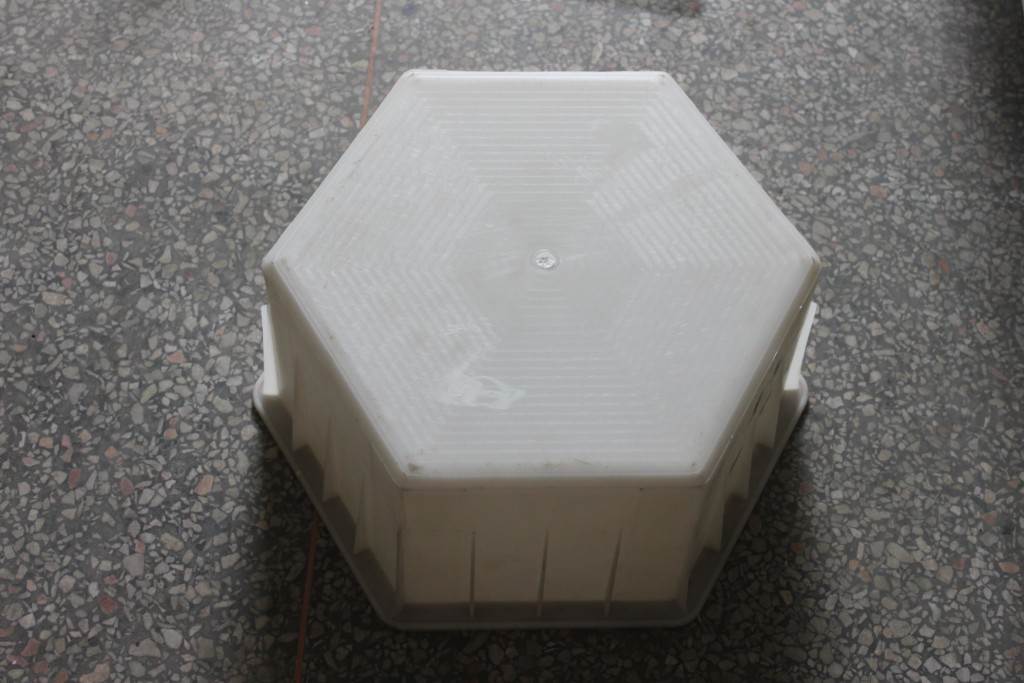 采用聚丙烯塑料原料經(jīng)注塑加工生產(chǎn)制造完成的實心六角護(hù)坡磚模具,外表白色透析,內(nèi)在堅韌耐用,是生產(chǎn)高質(zhì)量實心六角護(hù)坡磚難得的塑料模具制品。實心六角護(hù)坡磚模具整體結(jié)構(gòu)簡單,呈一個塑料盒子樣子,上面開口用于水泥澆筑,所以有不少地方也稱為實心六角護(hù)坡磚模盒。