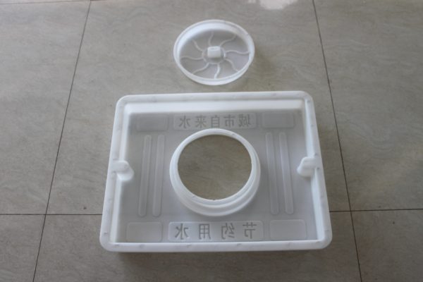 此水泥方井蓋模具采用聚丙烯樹(shù)脂經(jīng)注塑加工而成,模具兩端以小開(kāi)口設(shè)計(jì),以方便后期檢查時(shí)的位置移動(dòng)。在方井蓋模具的表面加以防滑條及供水部門(mén)專(zhuān)屬字樣,即“節(jié)約用水”和“城市自來(lái)水”標(biāo)志。而在方井蓋模具的中間設(shè)立一個(gè)小型的圓孔蓋座,為日后水廠(chǎng)對(duì)于自來(lái)水管的檢查工作帶來(lái)更大便利。