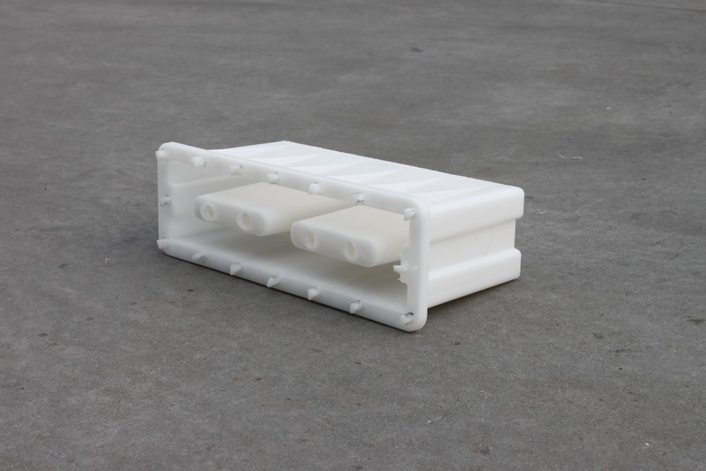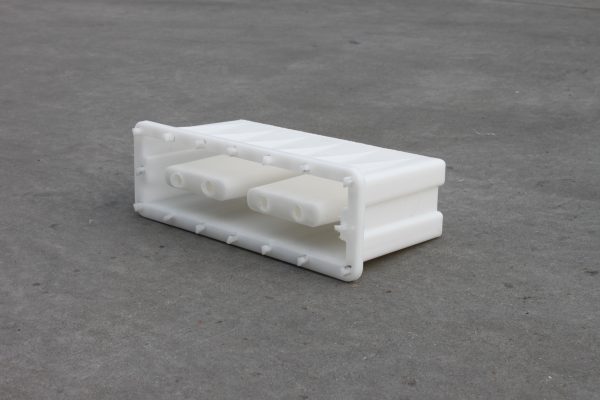 而這個(gè)塑料空心磚模具主要采用兩孔設(shè)計(jì),因?yàn)樗嗷炷撩芏容^重,在加上塑料材質(zhì)的模具基本都具備一定韌性,填充量過多易導(dǎo)致模具膨脹使得水泥空心磚成品變形,所在模具四周均采用加強(qiáng)筋設(shè)計(jì),對于防止這種情況的發(fā)生作用還是相當(dāng)穩(wěn)定的。