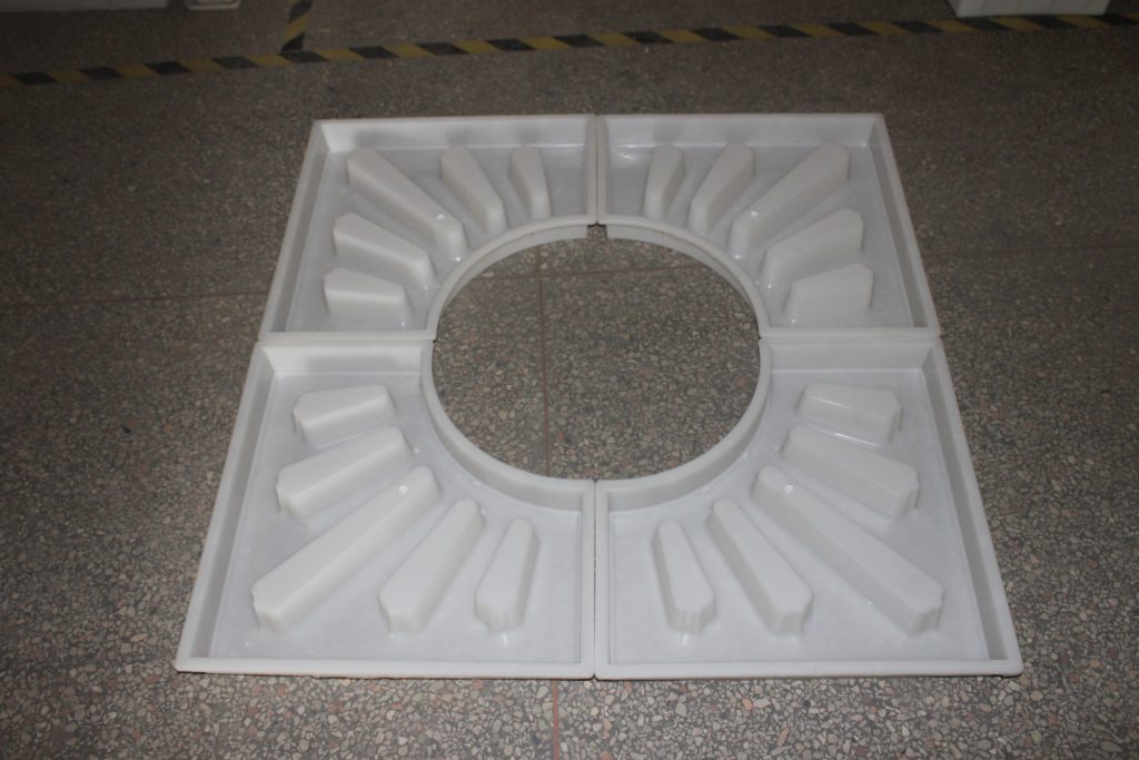 太陽(yáng)型水泥樹圍模具主要采用了PP聚丙烯塑料為原料,經(jīng)注塑加工完成。主體結(jié)構(gòu)由四塊拼接組成,由于塑料模具表面由類似陽(yáng)光一樣的線條設(shè)計(jì),遂得名太陽(yáng)型樹圍模具。不要小看這一條條的線條設(shè)計(jì),除了在美觀結(jié)構(gòu)上有所表現(xiàn),最為關(guān)鍵的是在實(shí)際成品的空隙之處方便綠草生長(zhǎng),增強(qiáng)土壤結(jié)構(gòu),對(duì)于樹木的保護(hù)更為有力。