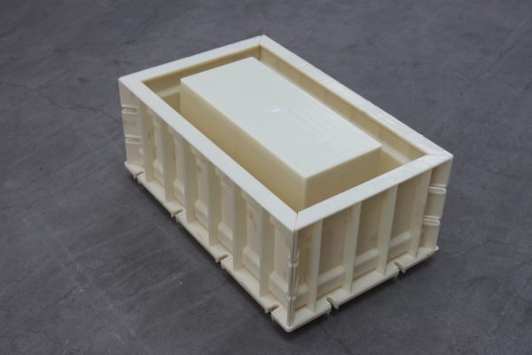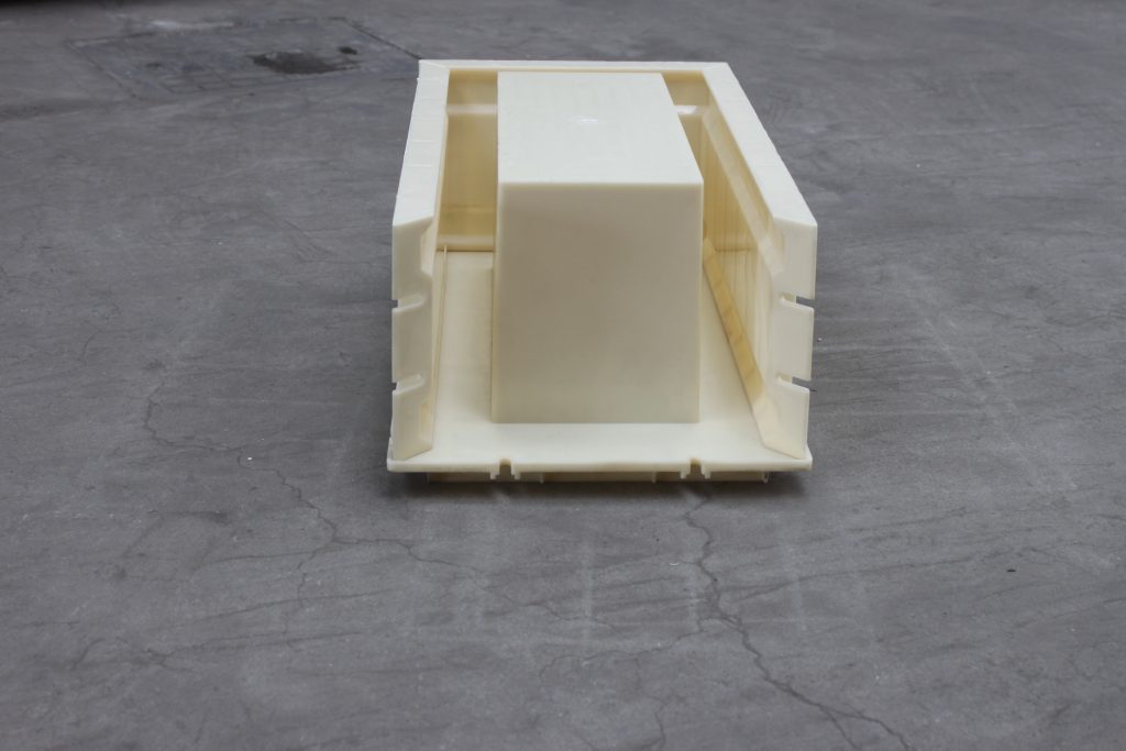 ABS材質(zhì)的空心磚塑料模具,整體呈長方形樣式,總共分為三個部分,空心磚塑料模具底座、側(cè)面短板及側(cè)面長板,在長板與短板鏈接處均采用橢圓凹槽,用于鐵質(zhì)螺絲螺帽拆卸裝配。鑒于塑料模具自身尺寸較大,為了使得空心磚塑料模具施工更為耐用牢固,在每一個配件背部分別采用十字加強筋設計,以確保正常施工。