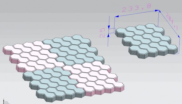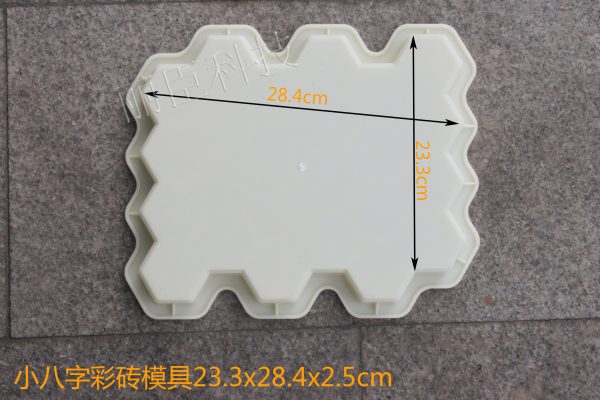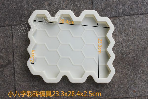 這款小八字彩磚塑料模具外觀上呈現(xiàn)出不規(guī)則形狀,遠(yuǎn)處看過(guò)去外觀有些像蜂巢的樣式,彩磚模具的規(guī)格為28.4×23.3×2.5,彩磚塑料模盒在制作過(guò)程中采用全新的ABS為主要生產(chǎn)原料,至成型后的彩磚塑料模具外觀整體呈現(xiàn)一種淡鵝黃色,其模具表面能有明顯的光澤感,下面這張圖是小八字彩磚模具澆筑成型后的模型款式。