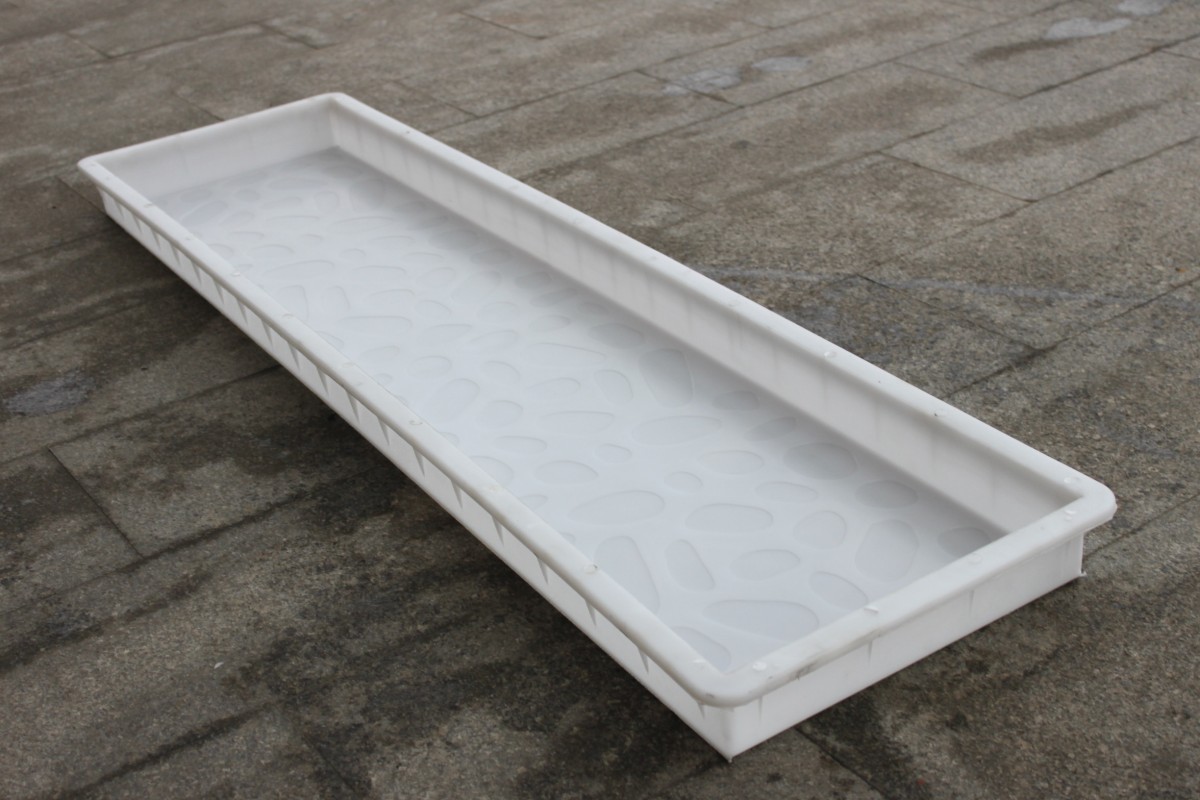 長條高速蓋板模具主要設(shè)計結(jié)構(gòu)為鵝卵石凹凸印制,模具側(cè)部分別添加加強(qiáng)筋以保證不易變形及水泥制品脫模次數(shù)。在實際水泥制品生產(chǎn)過程中,填料,干透,再使用水泥基建設(shè)專用震動平臺脫模,高速蓋板成品鵝卵石凹凸有致,減少路面防滑等產(chǎn)生不必要的危險因素。根據(jù)高速蓋板模具的實際尺寸,在水泥蓋板澆筑過程中,亦可適當(dāng)添加一些鍍銅鋼纖維來增加高速蓋板的整體結(jié)構(gòu)牢固度。